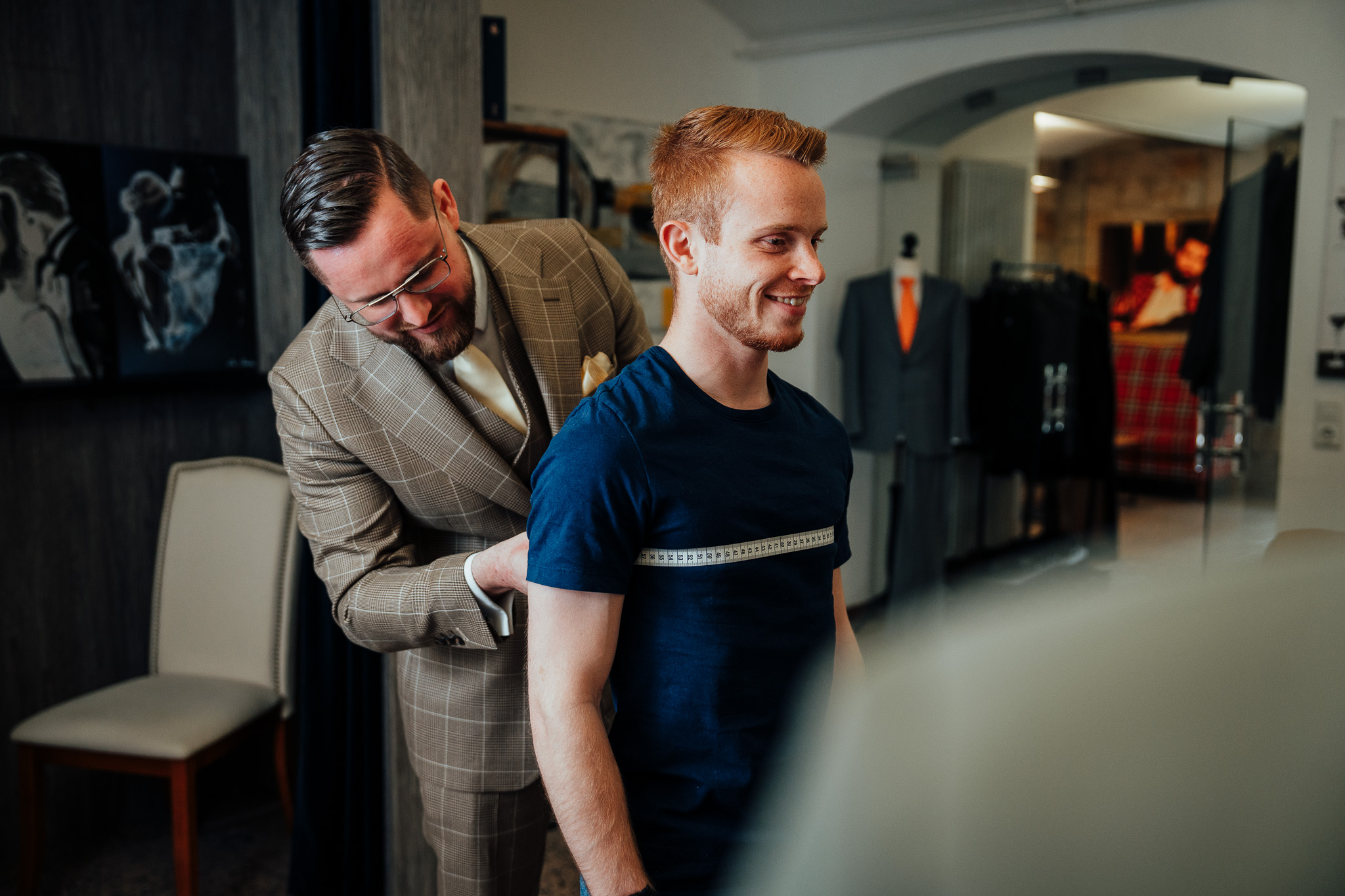 Ein echter Anzug nach Maß entsteht bei uns aus Millimeterarbeit: Schnitt, Balance, Schulter, Taillierung und Länge werden exakt auf deinen Körper und deinen Alltag abgestimmt. Ergebnis: eine Silhouette, die sitzt – und wirkt.