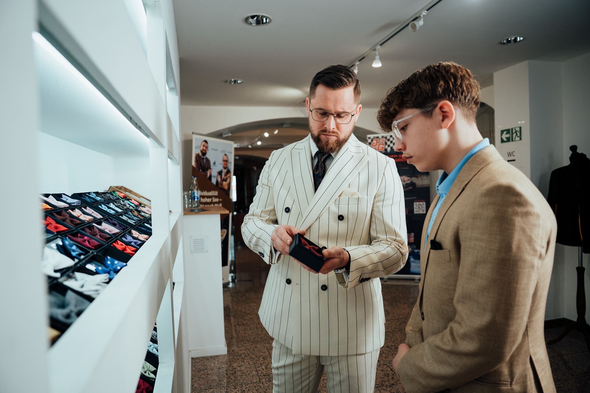 Unsere Maßanzug-Beratung ist individuell, nicht beliebig: Wir führen dich sicher zu deinem Look – modern, souverän, tragbar. Ob minimalistisch, klassisch oder mit Charakter: Du bleibst du.